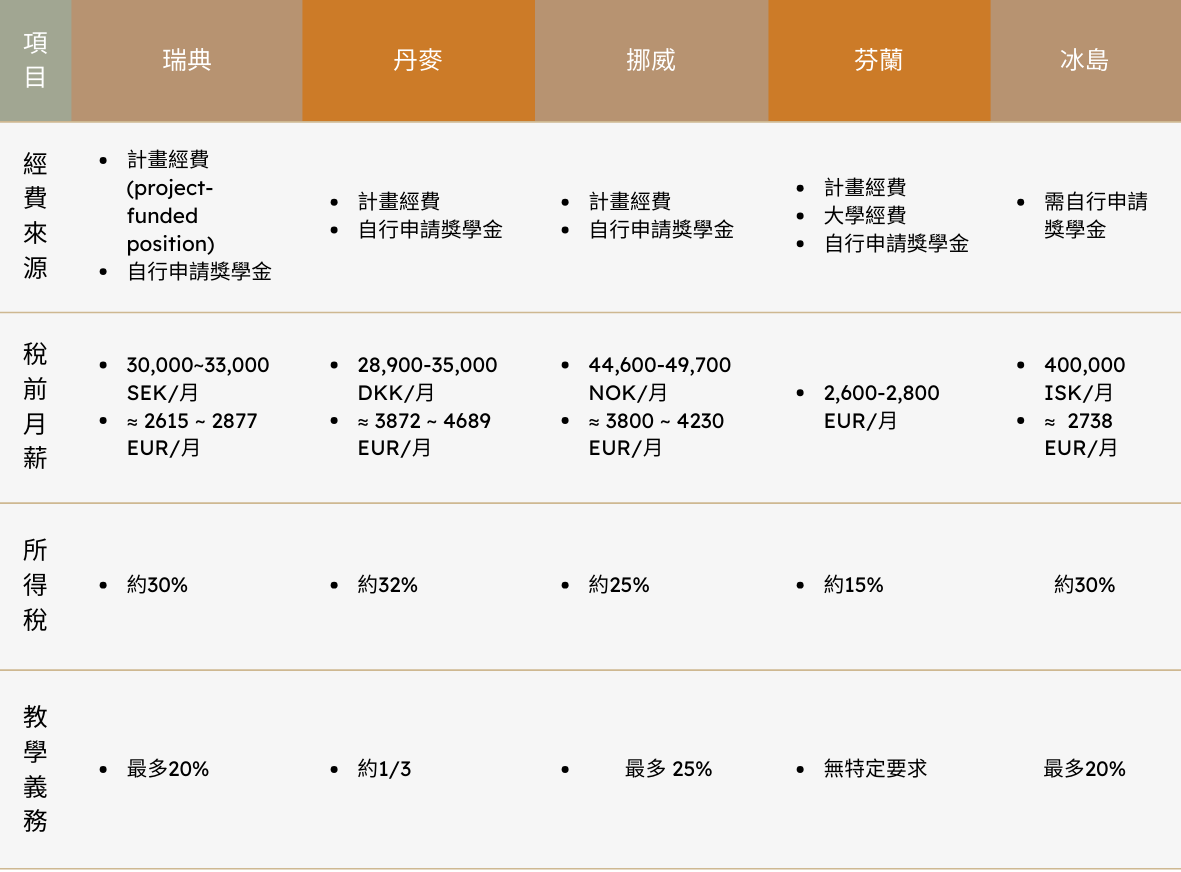 - 備註1: 北歐的博士多為100%,也就是全職的工作,經費來源多來自計畫的出資方(政府、公司、研究機構、歐盟)。